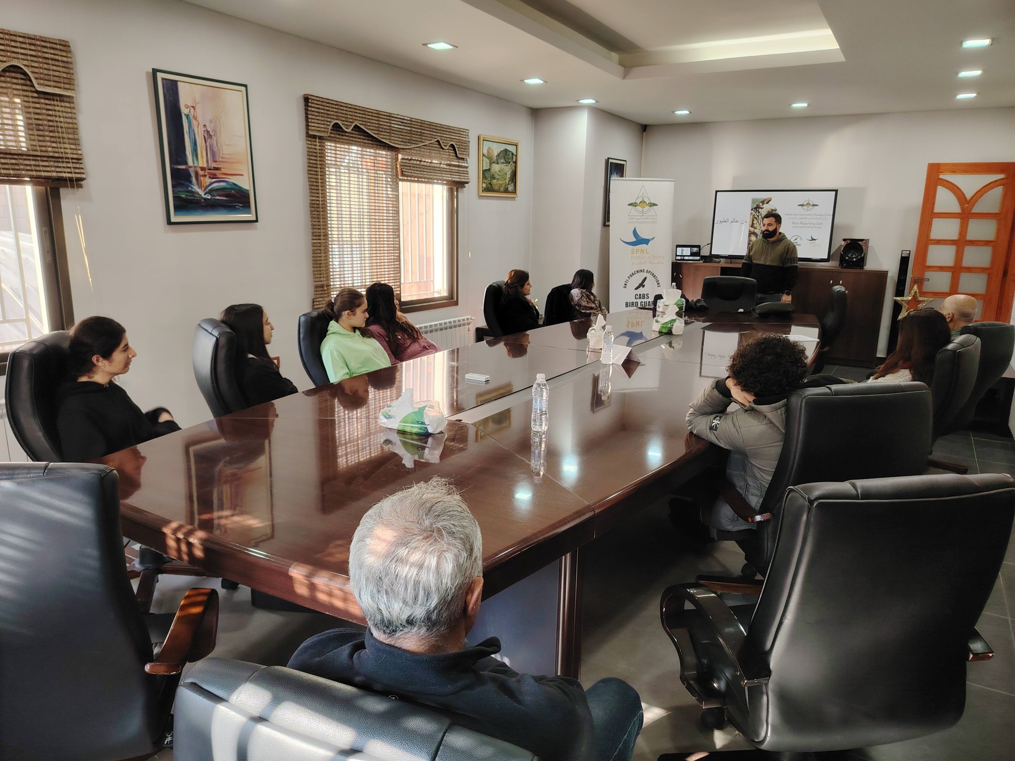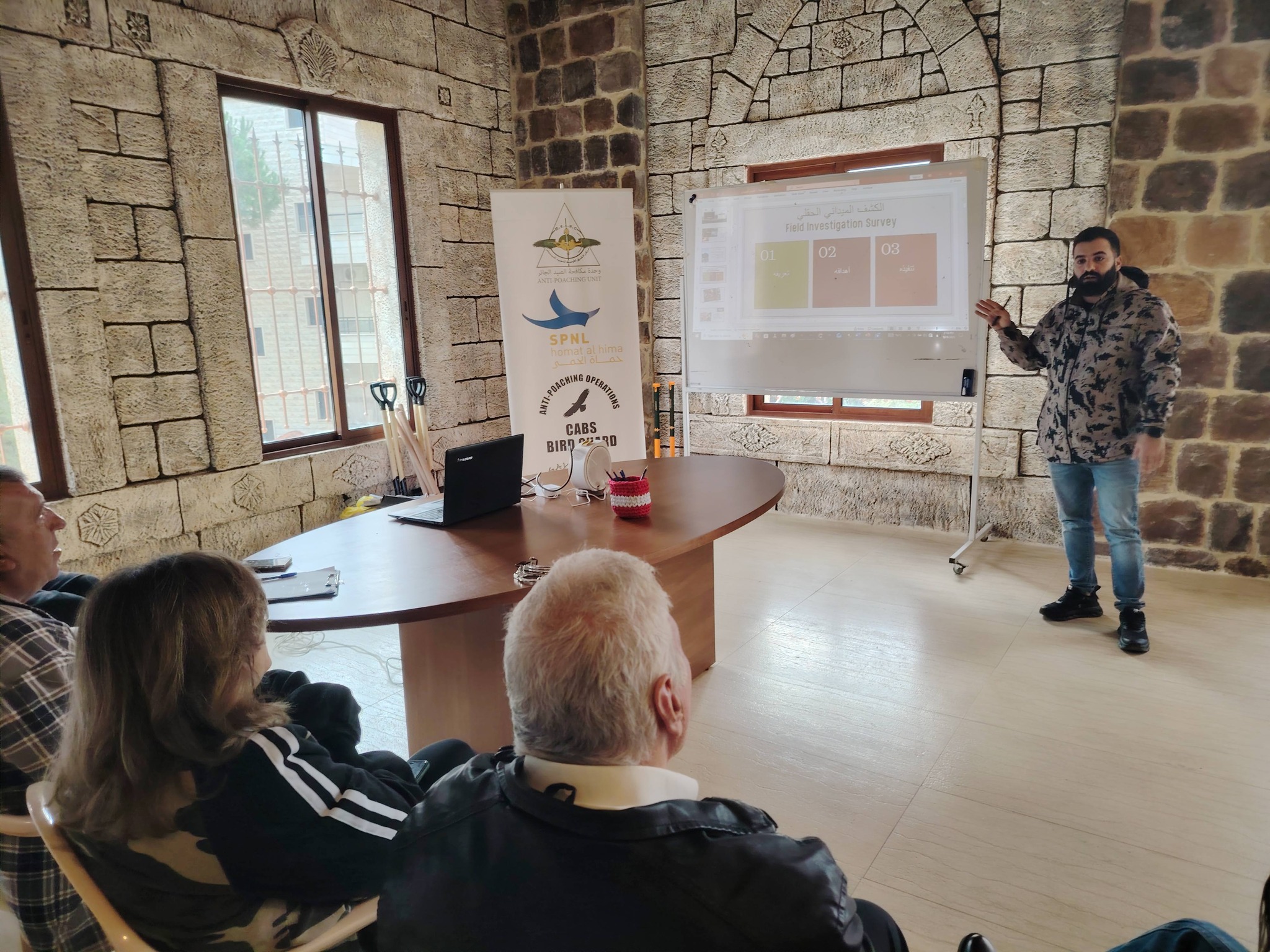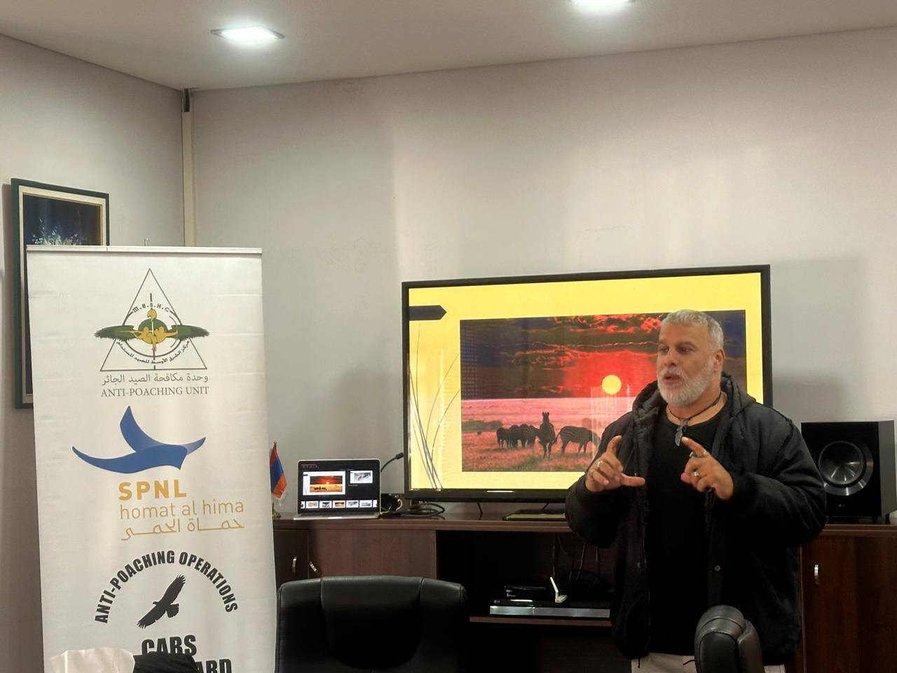 The Anti-Poaching Unit APU (MESHC – SPNL – CABS), in cooperation with the Municipality of Anjar, delivered an awareness session for Hima guardians and hunters. The session introduced the work of the APU, highlighted the importance of birds and some of their distinctive behaviors, and included practical information on wildlife photography and camouflage techniques.